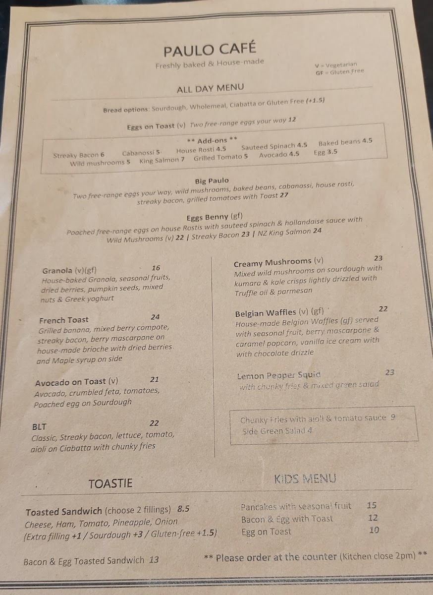 Welcome to Paulo Cafe, a delightful compact retreat nestled in Milford, Auckland, where every meal feels like a special occasion. The menu offers something for everyone; start your day with their enticing Eggs On Toast, priced at NZ$14.00, which is a local favorite. For the little ones, the Kids Menu features delicious options like Pancakes with Seasonal Fruit at NZ$15.00, ensuring even the youngest patrons leave happy.